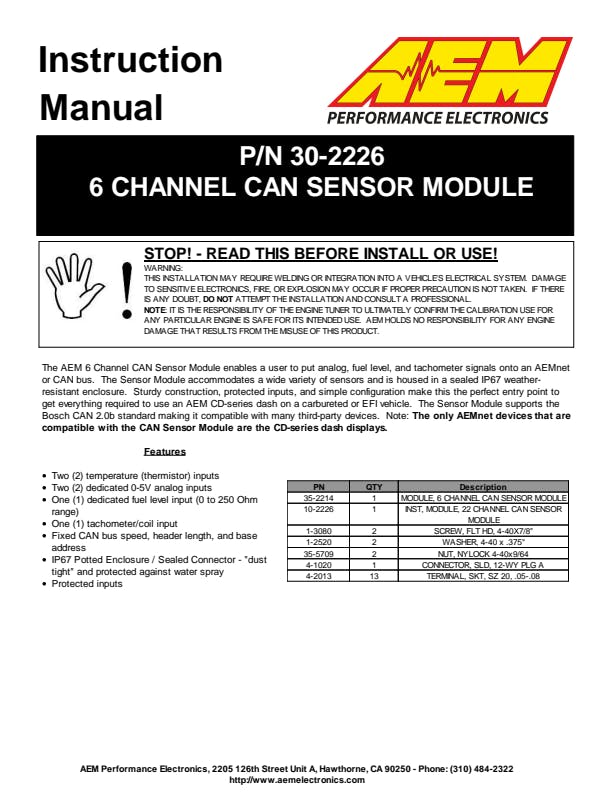 Converts two analog temp channels, two analog pressure channels, a tach input and fuel level input to AEMnet CANbus
