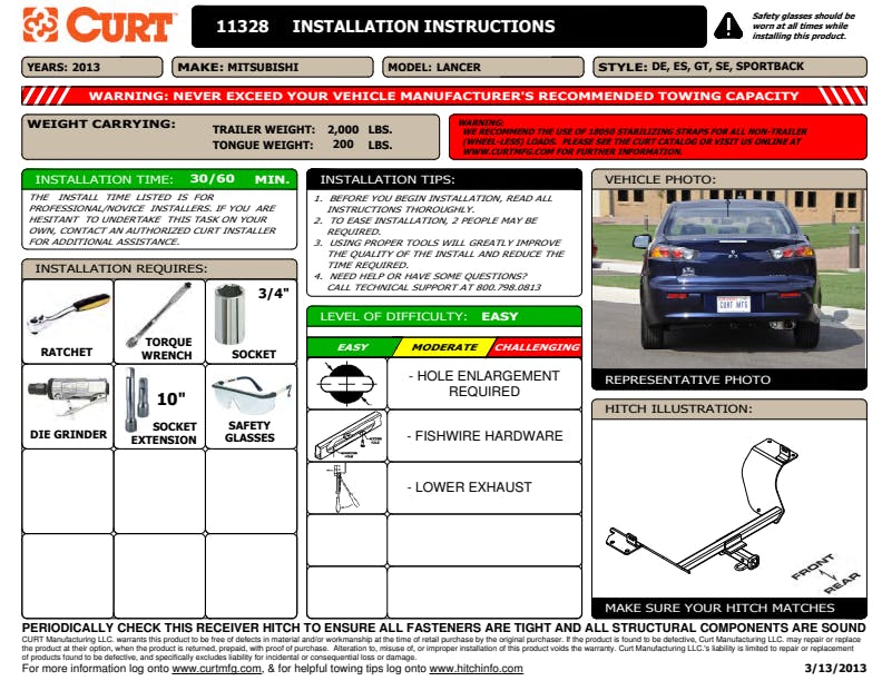However you define adventure -- whether it's climbing onto the back of a mountain bike, hunting from the top of a tree stand or camping with the family a long way from nowhere -- CURT class 1 hitches provide a light-duty towing receiver to help you Bring It. Each is made to fit a specific vehicle, providing easier installation, a better fit and optimal towing capacity. Custom class 1 trailer hitches are available for a variety of smaller vehicle types, including the compact car, crossover, minivan and small SUV. This particular class 1 hitch is designed to be a custom hitch for certain years of the Mitsubishi Lancer (to verify vehicle compatibility, see the CURT application guide at curtmfg.com). Tested in accordance with SAE J684, it offers a weight carrying capacity of 2,000 lbs. GTW and 200 lbs. TW. It is equipped with 1-1/4 receiver tube opening to accept a ball mount shank or other hitch mount. This class 1 hitch also comes with all necessary mounting hardware. With its lightweight design and smaller receiver tube size, a class 1 hitch is especially useful for adding cargo space with a hitch-mounted bike rack or cargo carrier. They can also typically be used to tow small trailers such as a utility trailer, kayak trailer or teardrop camper (never exceed the lowest weight capacity of any towing component; i.e. the vehicle, hitch, trailer, etc). Though CURT class 1 trailer hitches are only intended for light-duty towing, we apply the same principles of quality as we do to the rest of our rear mount hitches. Each class 1 hitch is made with hands-on engineering, high-strength steel and precise welding. We use a co-cured finish of liquid A-coat, inside and out, and durable black powder coat to provide a lasting defense against rust, chips and UV rays.