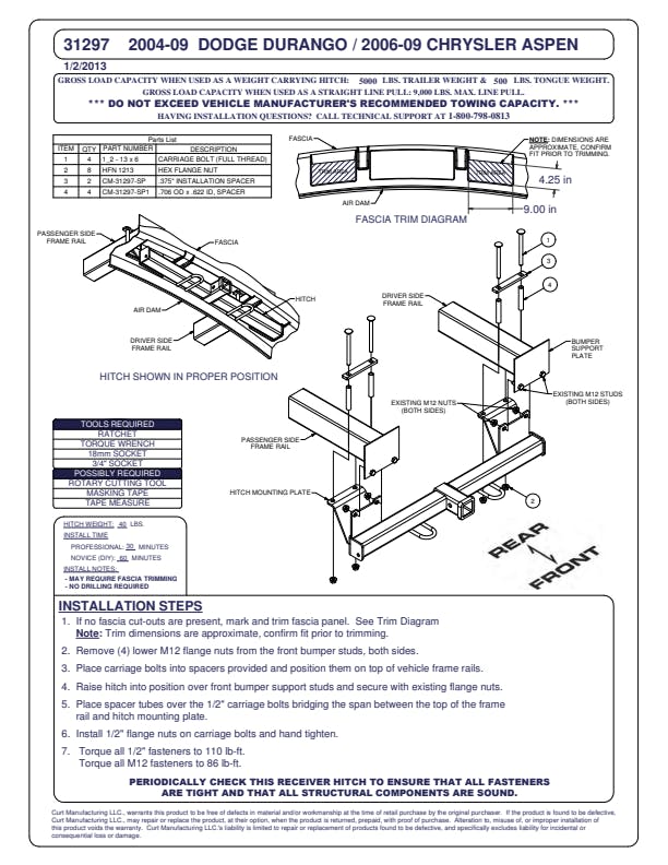 A CURT front trailer hitch allows you to use the front end of your vehicle for a variety of towing applications. They can be used for mounting a winch, a snow plow, a number of towing accessories and can even be used for some trailering applications. When space is limited, a front trailer hitch is commonly used to hold a cargo carrier, freeing up space inside the vehicle for extra cargo and making the rear mount receiver available to pull a trailer. At the boat ramp, your boat trailer can be hitched up to the front receiver hitch, giving you better control over the trailer as you launch. Some of the other accessories that can be used with a front tow hitch are the CURT winch mount, step pad, license plate holder, spare tire mount, skid shield and tow hooks. All CURT front trailer hitches provide a useful receiver tube to accept a 2 in. x 2 in. shank, and they are commonly used on trucks, vans and SUVs. This front trailer hitch is rated for 5,000 lbs. GTW and 500 lbs. TW. It also has a straight-line pull rating of 9,000 lbs. It is designed to be a custom trailer hitch for certain years of the Chrysler Aspen and Dodge Durango (to verify your vehicle compatibility, see application info). It comes with all necessary hardware for a complete installation and is backed by a limited lifetime warranty.
