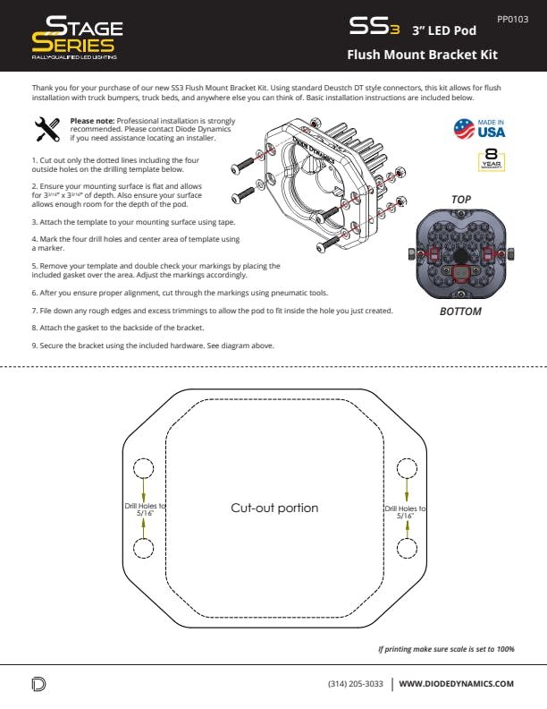 Included in the box: Two (2) SS3 3inch Flush LED Pods. Two (2) Deutsch-style wire pigtails. Two (2) Flush Frame Gaskets. Mounting hardware and drilling template. Specification guide.