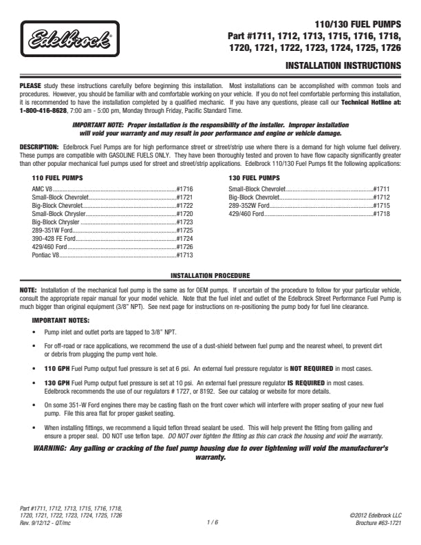 Edelbrock part #1724 Performer RPM Series fuel pump is for 352-428 FE Ford designed for use with all Edelbrock carburetors used in Performer or Performer RPM applications. These high-performance's street Fuel Pumps feature a high quality three stage polished finish. The unique valve design improves flow quantity and quality, and will support engines up to 600 hp. High-volume, 3/8" NPT inlet and outlet surpasses the capacity of conventional models. Produces 6 psi and does not require a regulator. Use with gasoline only. Clockable lower housing can be rotated in 60 Deg Increments for best inlet/outlet alignment.