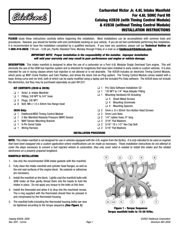 Edelbrock part #2838 Victor Jr. Ford 4.6L SOHC intake manifold for Ford 4.6L SOHC Modular engines allows the customer to take any 1999-2004 SOHC Modular 4.6L engine and convert it for use with a carburetor. Timing control module available separately. Not intended for or as a stock replacement intake manifold.