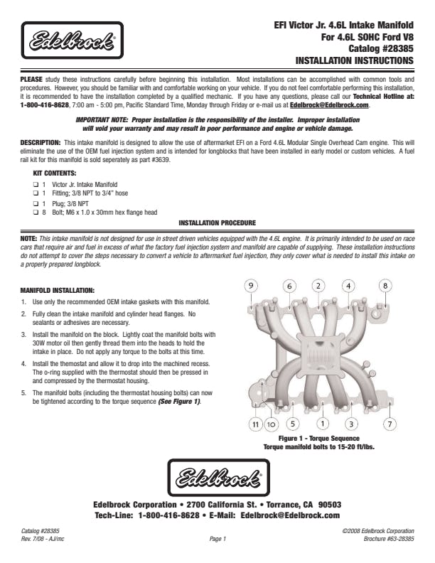 Edelbrock part #28385 Victor Jr. Ford 4.6L SOHC EFI intake manifold is designed for Ford 4.6L SOHC Modular engines, 1999-2004 SOHC Modular 4.6L engine is designed for 4.6l Ford's using EFI in racing. Timing control module available separately. Not intended for or as a stock replacement intake manifold. Whether you're building a daily driver, ultra high-performance's street machine or race car, an Edelbrock intake manifold will provide the power right where you want it. The Edelbrock Victor Jr. Ford 4.6L SOHC also features a natural aluminum finish for a classic look. For the ultimate "Made in USA" quality, every Edelbrock intake manifold is cast and machined in the USA.