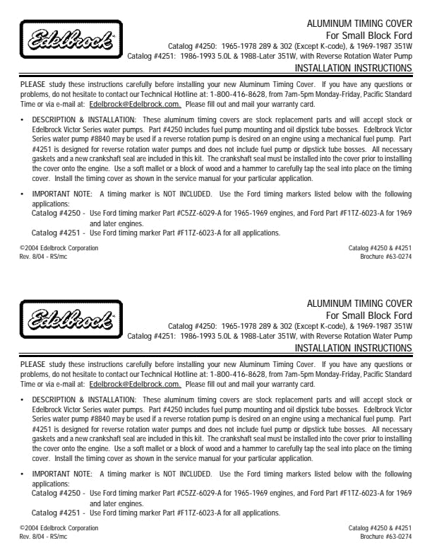 Edelbrock part #4250 for 1965-78 289 (non K-code) & 302 1969-87 351W These die-cast aluminum timing covers for Ford are stock replacement parts for late model EFI 5.0L and 351W engines. Includes gaskets and crankshaft seal. Both are compatible with stock or Edelbrock Victor Series aluminum water pumps.