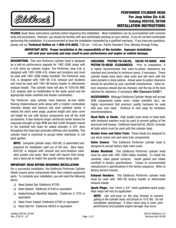The Edelbrock #50169 Performer Cylinder Head is designed as a bolt-on performance upgrade for 1987-2006 Jeep's with a 4.0L inline six engine. They feature better flowing intake/exhaust ports along with a modern combustion chamber design and back cut and swirl polished valves for improved flow. Retains the stock valve angle, pushrod length and valve cover bolt pattern for use with factory components and off the shelf accessories. Larger reinforced rocker bosses for improved strength at high RPM and Heli-Coil threaded inserts in the intake manifold bolt holes for added strength as well as a 3/4" deck throughout the head also promotes stiffness and durability. This cylinder head is machined to accept both distributor or coil pack ignition. To optimize airflow, this cylinder head is designed with a 1991-2006 4.0L intake port location and 1991-98 4.0L exhaust port size. As a result, this cylinder head must be used with a 1991-2006 intake manifold and a 1991-1998 exhaust manifold. Aftermarket exhaust headers can also be used in place of 1991-1998 exhaust manifolds and MUST be used in place of 1999-2006 exhaust manifolds. Most aftermarket exhaust headers are compatible, but please check with the exhaust header manufacture to verify. This head is NOT compatible with 1999-2006 OEM exhaust manifolds.