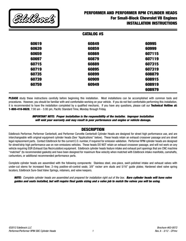 The Edelbrock #60759 Performer cylinder head is designed for 302, 327, 350 and 400 cid small-block Chevy engines up to 1986. This cylinder head includes your choice of 64cc (In order to retain stock compression ratio on 1970 and earlier small-blocks) or 70cc combustion chambers and high flow intake and exhaust ports. A Complete head includes larger-than-stock 1.46" valve springs to handle most high-lift cams. This head retains the stock intake port location for compatibility with standard manifolds and headers. Heat crossover is machined for 50-state emissions legal performance.
