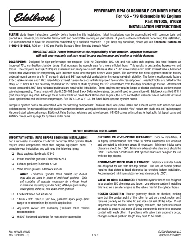 Although these heads will fit on Big-Block Oldsmobile engines, the 68-cc combustion chamber size is not ideal for a big-block application as it will raise compression. See PN61025 and PN61029 for big-block specific cylinder heads.