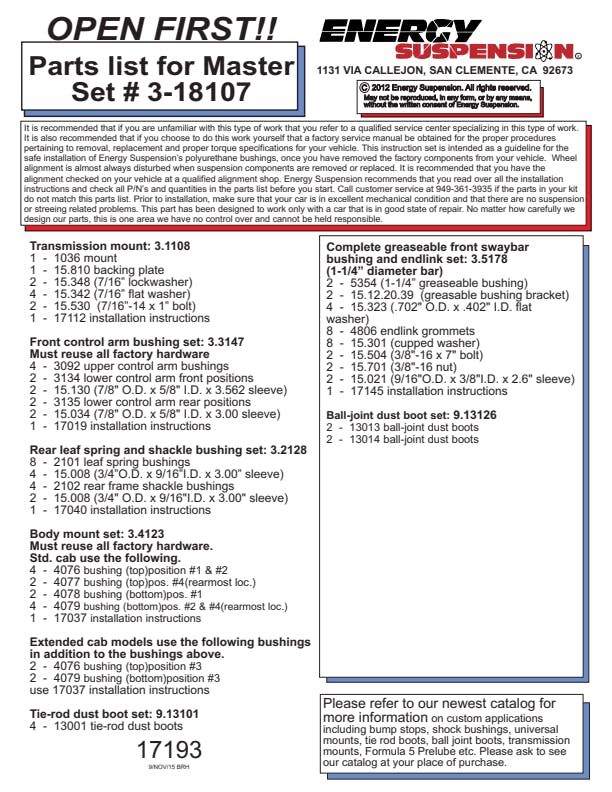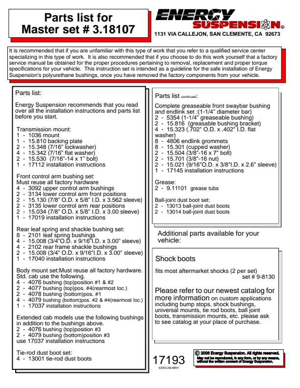 Energy's Hyper-Flex(TM) is superior performance polyurethane which has proven itself under the most demanding conditions on the race track, off-road and street performance driving, Hyper-Flex(TM) components do not wear or deteriorate from exposure to undercar chemicals such as oils and coolants and withstand atmospheric conditions like UV exposure and pollutants. Impervious to these elements, Energy's Hyper-Flex(TM) components are a great value. Not only will it outlast rubber 5 to 1 but are a cost effective performance improvement for your car or truck. Whether domestic or import, front, rear or 4WD, old or new, your vehicle will achieve that level of performance that has made Energy Suspension the most asked-for name in performance polyurethane components. All Hyper-Flex(TM) components are proudly Made in America and are available in red or black.