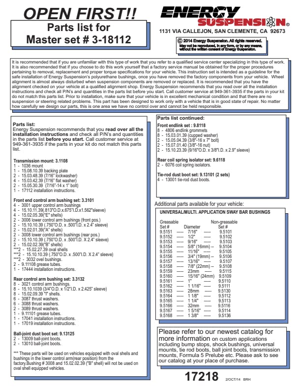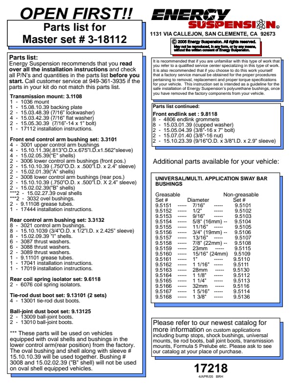 Energy's Hyper-Flex(TM) is superior performance polyurethane which has proven itself under the most demanding conditions on the race track, off-road and street performance driving, Hyper-Flex(TM) components do not wear or deteriorate from exposure to undercar chemicals such as oils and coolants and withstand atmospheric conditions like UV exposure and pollutants. Impervious to these elements, Energy's Hyper-Flex(TM) components are a great value. Not only will it outlast rubber 5 to 1 but are a cost effective performance improvement for your car or truck. Whether domestic or import, front, rear or 4WD, old or new, your vehicle will achieve that level of performance that has made Energy Suspension the most asked-for name in performance polyurethane components. All Hyper-Flex(TM) components are proudly Made in America and are available in red or black.