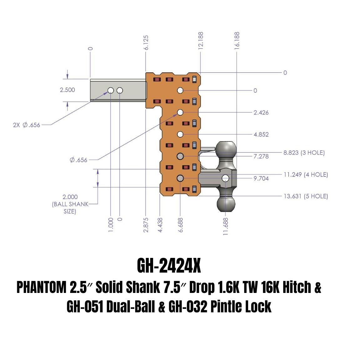 PHANTOM 2.5" Solid Shank 7.5" Drop 1.6K TW 16K Hitch & GH-051 Dual-Ball & GH-032 Pintle Lock