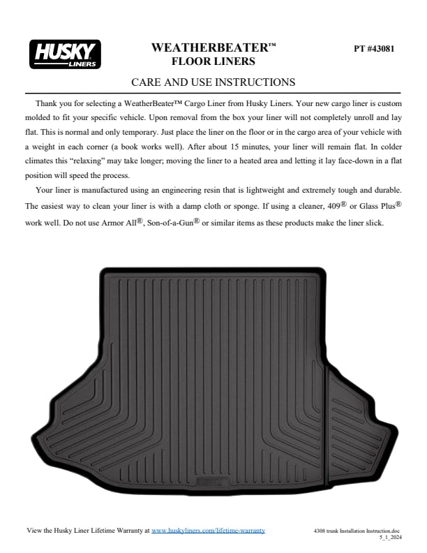 The original all-weather liner is ready, come hell or hot coffee. The Weatherbeater?s construction is a no-slip zone with zero edge curl, and its Stay Put Nibs keep it firmly anchored underfoot. It stands up to chemicals like gas, oil and battery acid, and stays tough and flexible, even under extreme temperatures. Its laser-scanned, FormFit Design? gives your truck, van or SUV an ultra-clean look with easy cleanup to match, while its patented, FormFit Edge? keeps spills contained, carpets unstained. It?s unbeatable Husky protection for life, warrantied the same. Proudly made in the USA.
