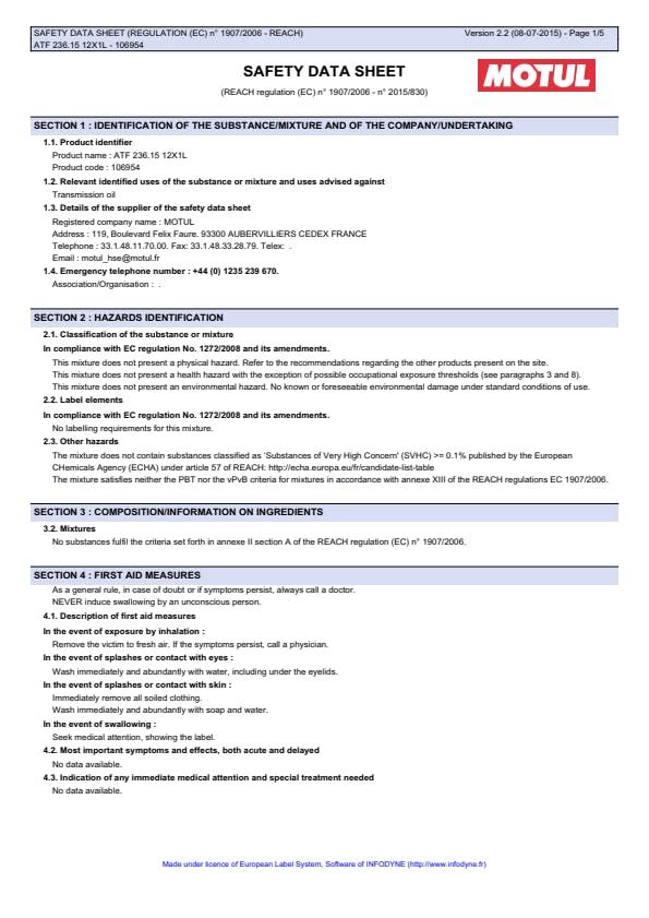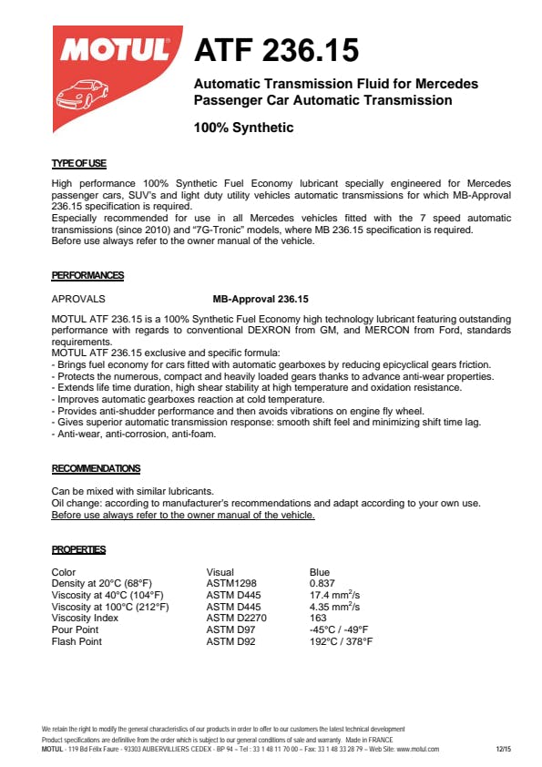 Additional Info Fully Synthetic AutomaticTransmission Fluid for Mercedes Benz; Standards: MB-Approval 236.15