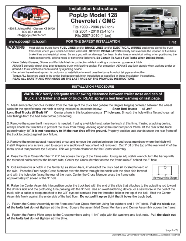 Smoother action and trouble free. We’ve made the best hitch even better. So simple you’ll wonder why you didn’t think of it. One pull of the handle to raise the ball is all it will take to convince you that this is the hitch you want. Try it and see. We’ve replaced the cam mechanism with a simple yet strong and reliable slide to raise and lower the ball. Pull the rod to raise the ball and push to lower. It’s that simple! When the ball is fully raised with the Roll Pin stop against the tube the ball is resting securely on the flat surface at the top of the slide. In this position, the Stainless Steel Detent Ball with 30lbs of spring behind it to mates with a hole in the bottom of the slide this prevents the slide from moving until the handle is pushed in to over-ride the spring. Quick, easy and clean. PopUp gives meaning to the phrase “User Friendly.” Tow when you need to and enjoy a smooth bed for all those other jobs when an ordinary hitch ball is always in the way. PopUp does not sacrifice strength for convenience. Hitches are rated at 7,500 lbs. maximum tongue weight and 30,000 lbs. maximum trailer weight. PopUp hitch components bolt together with the truck providing an extremely strong and reliable towing system. And you get this comforting strength with only a 3 hole in the truck bed floor, the smallest of ANY convertible gooseneck hitch ball you can buy. PopUp hitches are built specifically for each truck model ?? so they are a perfect fit. For safe towing, spring loaded U-bolts (which are level with the bed floor when not in use) are provided for anchoring Safety Chains. Front and Rear Cross Members are fabricated from 2 X 2.5 X .375 angle. Cross Members span and sit on top of the truck frame, thereby transferring all trailer tongue weight directly to the frame of the tow vehicle. Installation is quick and easy without lifting the bed of the truck. Does NOT require lowering exhaust, even on diesel trucks!