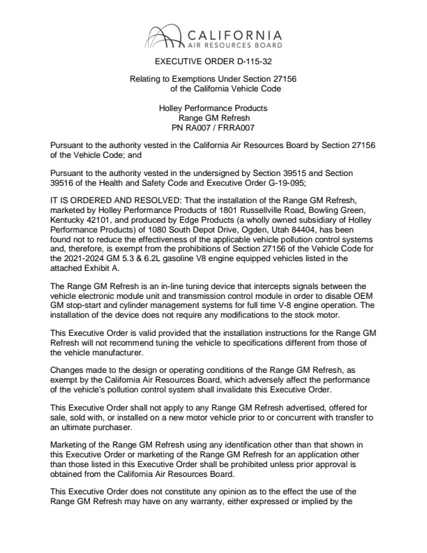 - 50-State CARB Compliant EO# D-115-32 for 2021-2024 model years. 2025-2026 pending