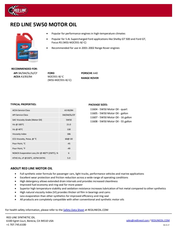 Red Line 5W50 Motor Oil is popular for performance engines in high-temperature climates, is popular for 5.4L Supercharged Ford applications like Shelby GT 500 and Ford GT, Focus RS (WSS-M2C931-B/-C), is recommended for use in 2001-2002 Range Rover engines, and is recommended for API SN/SM/SL/SJ/SH/SG/CF and ACEA A3/B3/B4. This fully-synthetic ester formula for passenger cars, light trucks, performance vehicles, and marine applications is designed to provide the highest protection, efficiency, and cleanliness, as well as superior drain intervals. It has excellent wear protection and friction reduction across a wide range of operating conditions. The high detergency allows extended drain intervals and provides increased cleanliness, while the improved fuel economy and ring seal allow for more power. It also has superior high temperature stability and oxidation resistance that increases lubrication of hot metal (compared to other synthetics). All products are completely compatible with other conventional and synthetic motor oils. Produced in only one top-of-the-line grade, these products offer the highest quality available on the market today and in the widest variety of viscosity. All products are completely compatible with other conventional and synthetic motor oils.