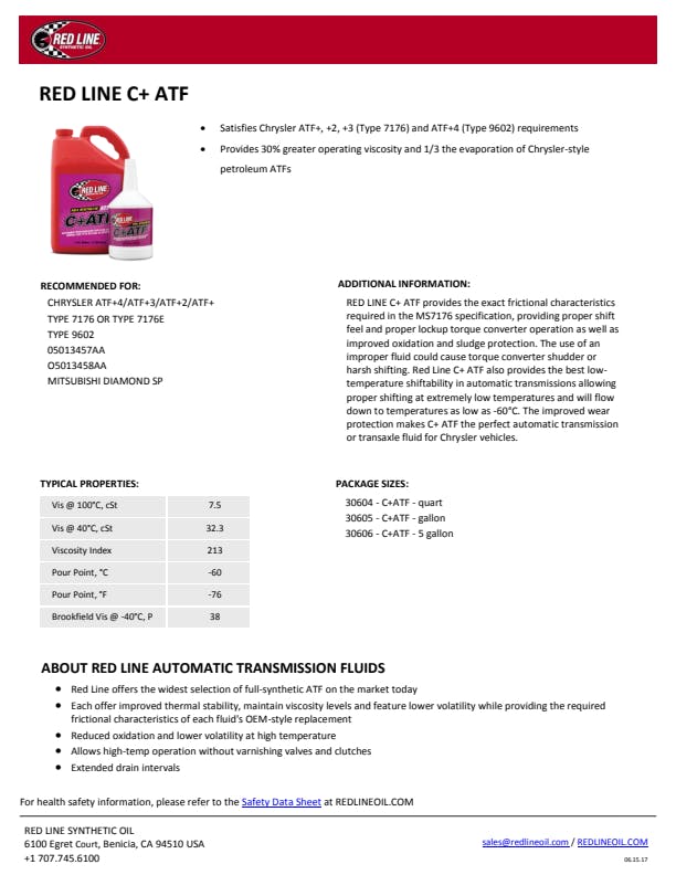 Your Jeep or Mopar-product doesn't need to go without the best ATF. With eight different combinations of viscosity, slipperiness, and OE-recommended additives packages, Red Line offers the widest selection of ATF available. RED LINE C+ ATF provides the exact frictional characteristics required in the MS7176 specification, providing proper shift feel and proper lockup torque converter operation as well as improved oxidation and sludge protection. The use of an improper fluid could cause torque converter shudder or harsh shifting. Red Line C+ ATF also provides the best low temperature shift ability in automatic transmissions allowing proper shifting at extremely low temperatures and will flow down to temperatures as low as -60°C. The improved wear protection makes C+ ATF the perfect automatic transmission or transaxle fluid for Chrysler vehicles.