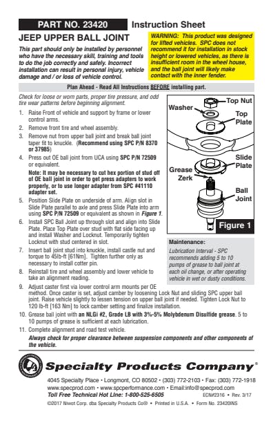 Add camber adjustment to your lifted Jeep Grand Cherokee or Commander with the highest quality ball joint on the market! This joint is specifically designed to work with raised suspensions and features: Induction hardened and oversized 18mm stud for extreme strength and high durability 700 hour salt spray resistant coating for long life Hybrid 2-piece race and internal spring compensate for wear over time Fully sealed greasable design to protect from the elements 80 of articulation to maximize travel without binding vs 66 on the factory joint. On the adjustable ball joint SPC uses hex chromate free finish and offers a 700hr salt spray test for the best corrosion protection available.