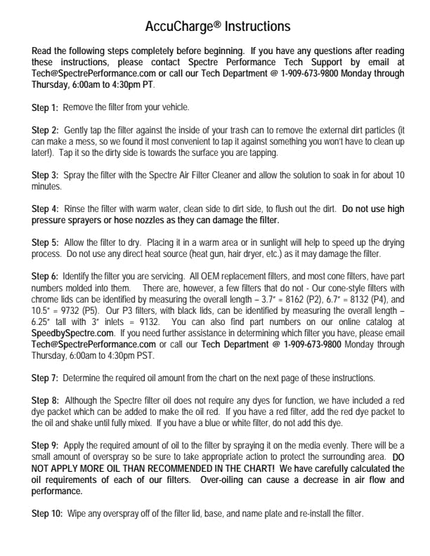 The Spectre Accucharge Precision Air Filter Cleaning and Oiling System was designed for all Spectre HPR replacement and racing air filters. Spectre's AccuCharge precision oiling system features graduation on the bottle for precise measuring and an easy-to-use squirt top bottle making the application both effortless and accurate. The system comes complete with a pump spray bottle of cleaner and one of filter oil, which is made from food grade mineral oil with absolutely no petroleum product or animal fats.
