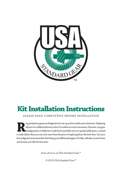 USA standard Master Overhaul kit. USA standard install kit offers a lower cost alternative when price must be kept low. This kit uses Koyo bearings and races. Included are carrier bearings and races, pinion bearings and races, pinion seal, complete shim kit, ring gear bolts, pinion nut, crush sleeve (if applicable), oil baffles and slingers (if applicable), threading locking compound, marking compound with brush and gasket.